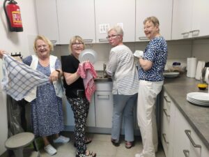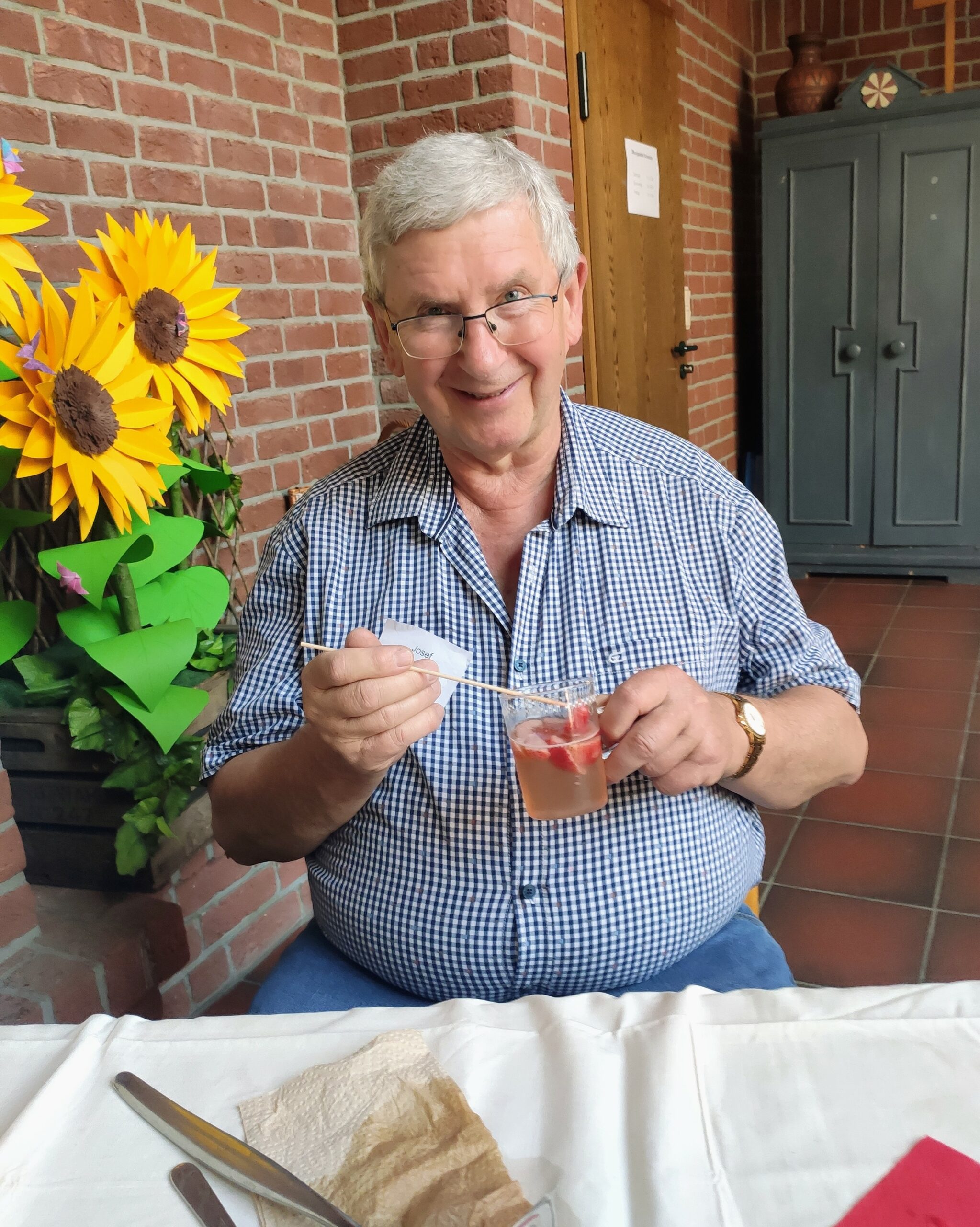 Wie verlockend das Aroma der roten Früchtchen aus der Region! Mit Vergnügen machten sich die „Methusalems“ über die herrlich duftenden, erntefrischen Erdbeeren her, um sie zu einer gehaltvollen Bowle zu verarbeiten. „Finger weg! Hier wird nicht genascht!“ gebot Peter Hoffmann den fleißigen Vorstands-Damen, stellte Zucker, Wodka und andere Zutaten auf den Tisch und verlas noch einmal sein „Spezialrezept“ für eine garantiert köstliche Bowle: „… dann kaltstellen und durchziehen lassen. Den Rest machen wir morgen.“ – Und der Morgen kam: 80 „Methusalems“ hatten sich zum Erdbeerfest angemeldet und 78 kamen. Da war viel Vorbereitungsarbeit nötig. Doch bei den „Methusalems“ geht alles Hand in Hand, denn nach dem detaillierten Einsatzplan unserer „Strukturkünstlerin“ Silvia Wesselmann bekam jeder seine Aufgabe zugewiesen und erfüllte sie zuverlässig. Alles lief wie am Schnürchen: Bald schon waren die Kaffeetafeln aufgebaut, einladend geschmückt und eingedeckt, die Riesenportionen Sahne geschlagen, der Erdbeerkuchen von Bäcker von Bargen geschnitten und das Empfangskomitee bereit, die Gäste zu begrüßen. Die kamen pünktlich, bereit zum gemeinsamen Schmausen. – Da die „Methusalems“ den Gemeindesaal der Kirche nutzen durften, war natürlich a
